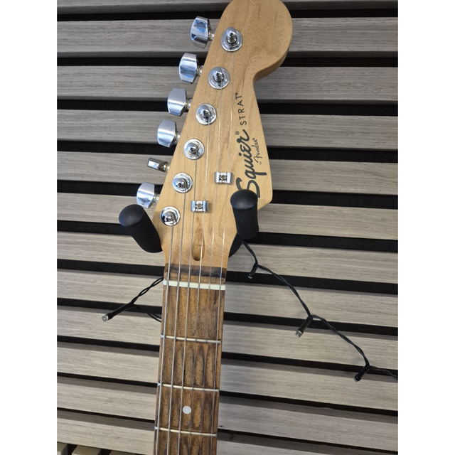 Fender Squier Stratocaster er en klassisk, prisvenlig elektrisk guitar inspireret af Fender Stratocaster-designet, velegnet til begyndere og øvede spillere. Den har en bolt-on hals (typisk i ahorn) med 22 bånd på et 25,5″ scale-gribebræt, som giver klar attack og god sustain. Kroppen er normalt lavet af poplar eller alder-træ, hvilket giver en afbalanceret tone. Instrumentet har tre single-coil-pickupper i traditionel Strat-konfiguration (neck, mid, bridge) og en 5-vejs pickup-vælger for alsidig lyd – fra skarpe, rene toner til mere fyldige rock- og blueslyde. Kontrollerne består af master volume og to tone-kontroller til justering af klang. Hardware omfatter en synkroniseret tremolo-bro for vibrato-effekter og die-cast stemmeskruer for stabil stemning. Finishen findes i flere farver, og guitaren har det klassiske Strat-look med pickguard og komfortabel kropskontur.